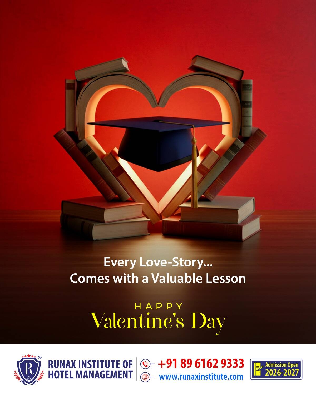 Keyline Digitech crafted this evocative visual for Runax Institute of Hotel Management, reimagining the iconic heart symbol through an arrangement of books, bathed in a warm golden glow, crowned by a graduation cap. The metaphor is deliberate and powerful, which conveys that every love story teaches you something, and every lesson shapes who you become.