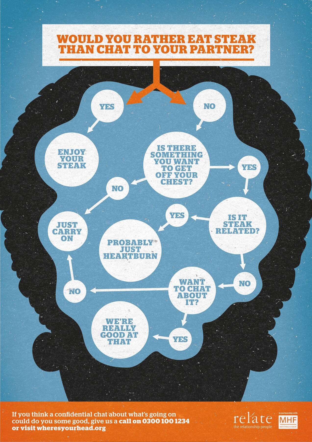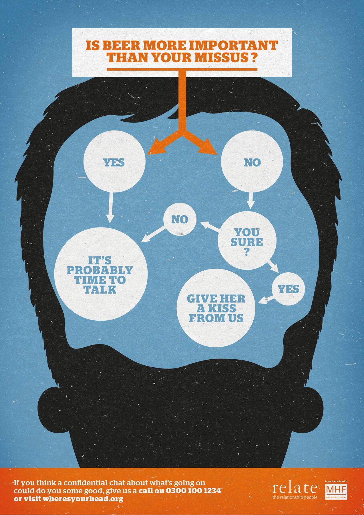 This professional campaign titled 'Where's Your Head At? - 3, Where's Your Head At? - 2, Whe...' was published in United Kingdom in January, 2013. It was created for the brand: Relate, by ad agency: BIG. This Print medium campaign is related to the Public Interest industry and contains 3 media assets. It was submitted almost 13 years ago.
