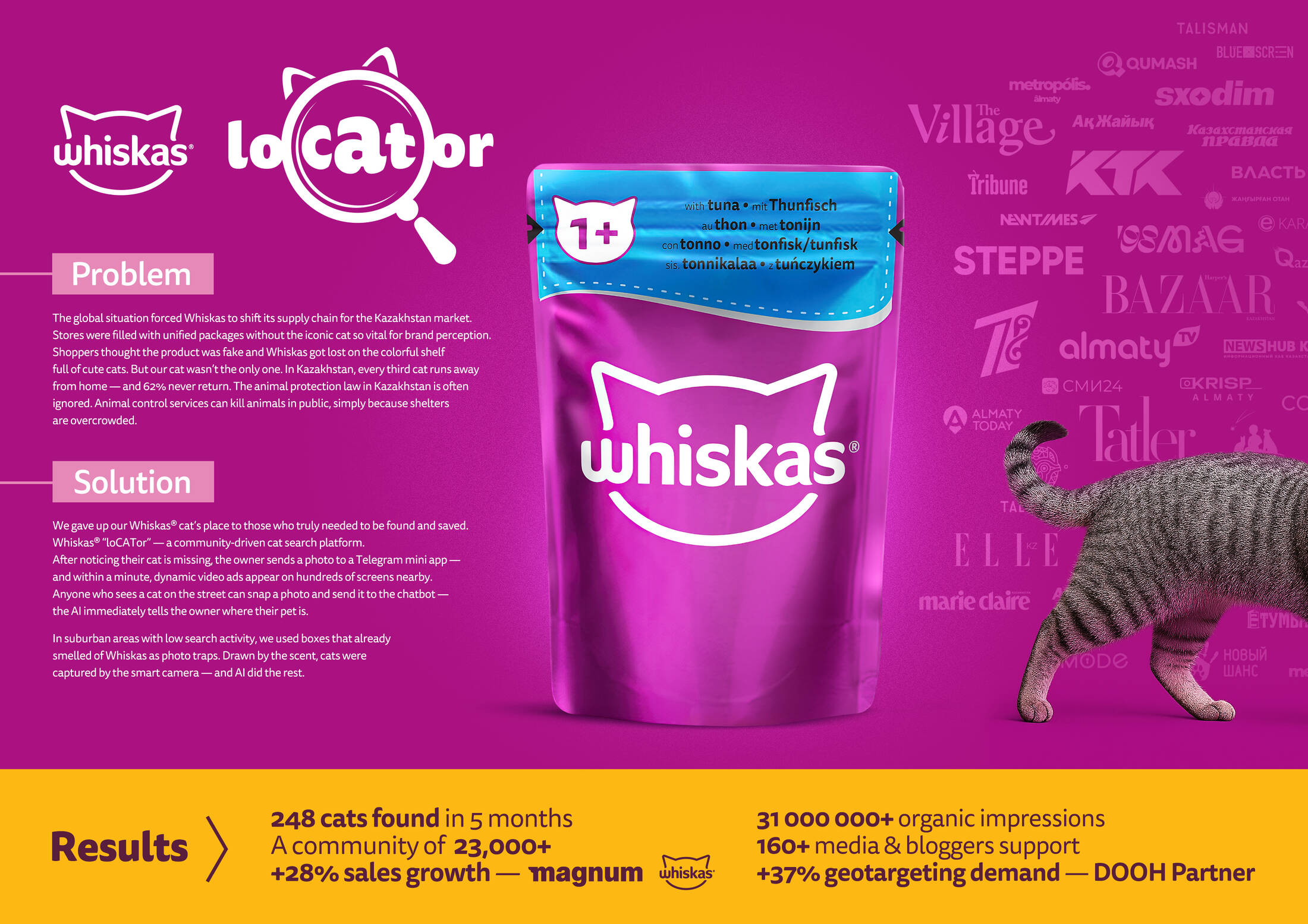 Whiskas loCATor is a cat search system that was created in response to major product supply challenges caused by the geopolitical situation in Ukraine. The campaign has won multiple awards at international festivals.