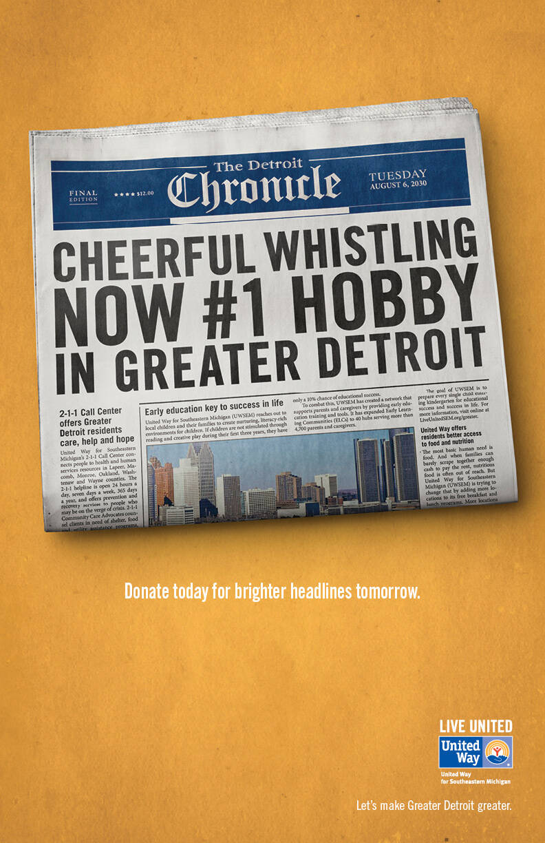 This professional campaign titled 'Whistle, Dream job, Cap and gown, Remote, No bad news' was published in United States in September, 2012. It was created for the brand: United Way, by ad agency: Team Detroit. This Print medium campaign is related to the Public Interest industry and contains 5 media assets. It was submitted about 13 years ago.