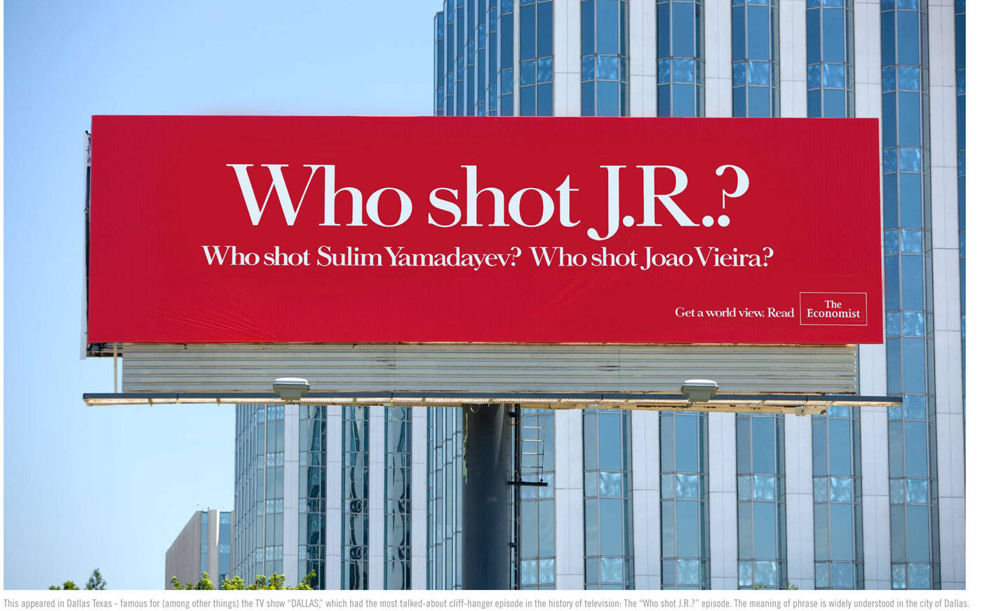 This professional campaign titled 'Who shot J.R., Bulls' was published in United States in June, 2009. It was created for the brand: The Economist, by ad agency: BBDO. This OOH Outdoor medium campaign is related to the Media industry and contains 2 media assets. It was submitted over 16 years ago.