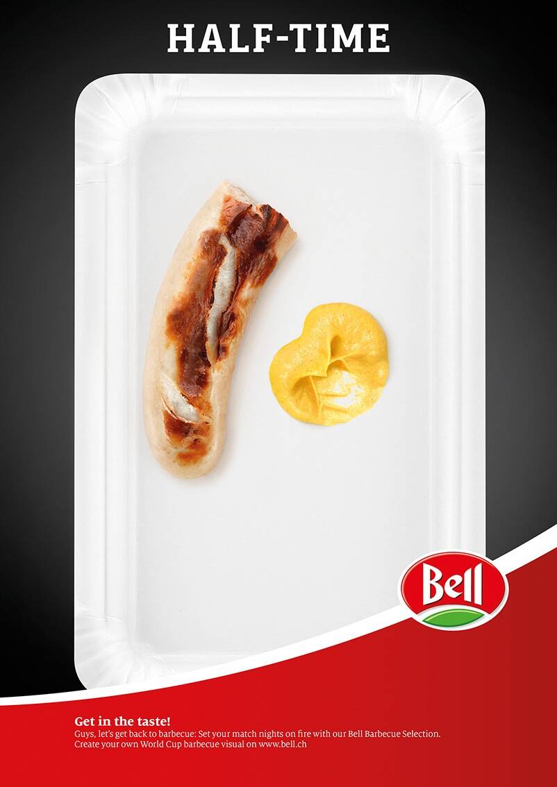 Football and barbecue – a perfect match. On the occasion of the Football World Cup, the Swiss meat producer Bell presented the ideal selection to defy the matches by interpreting typical football terms via their barbecue products, such as sausages, mustard and bread. The different advertisements were constantly actualized and even spontaneously adapted as reactions to the match results or memorable situations. At the same time the fans were implied and asked to create their own football-barbecue visuals with the online game on bell.ch.