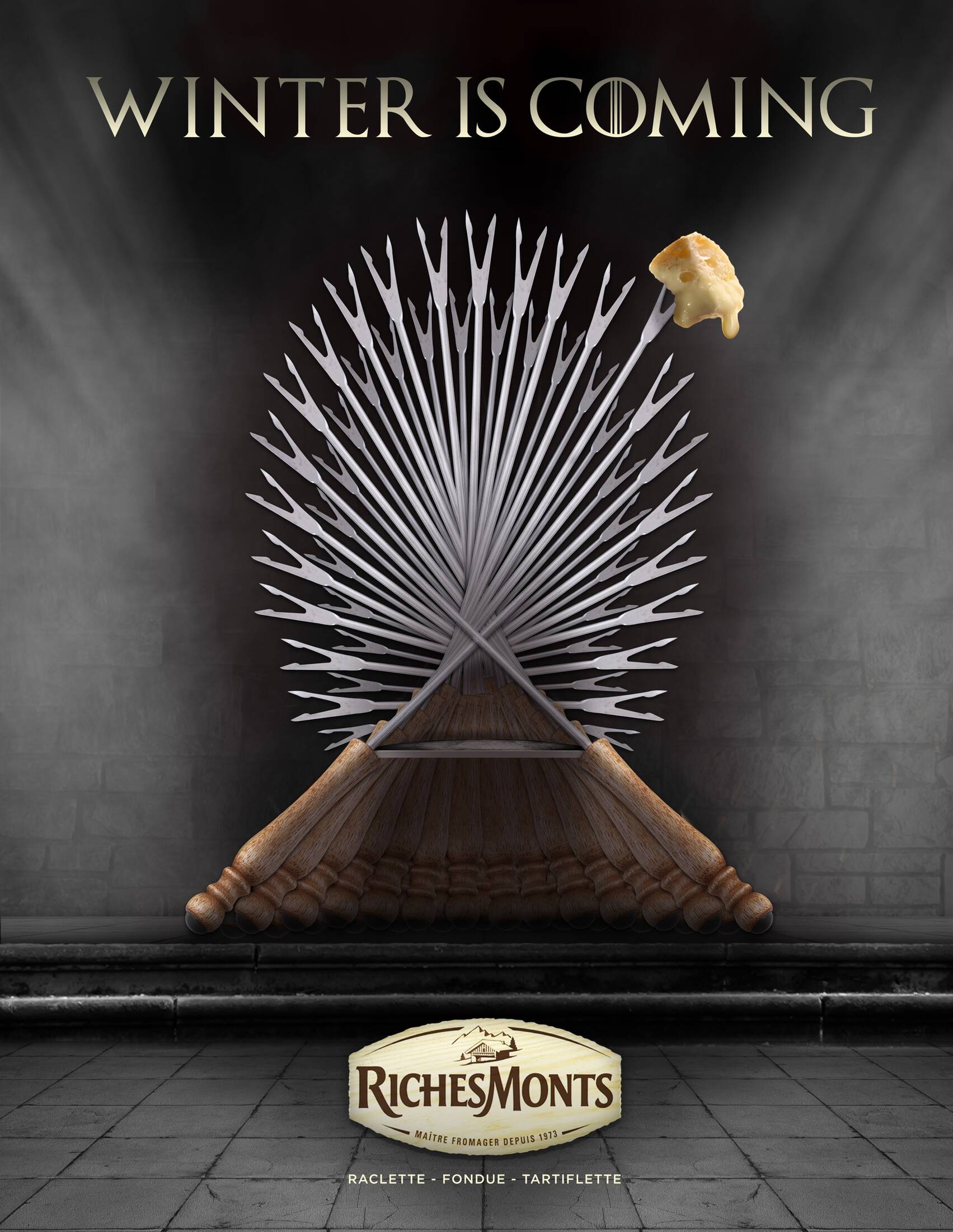 This professional campaign titled 'Winter is coming' was published in France in December, 2014. It was created for the brand: Richesmonts, by ad agency: WNP. This Print medium campaign is related to the Food industry and contains 1 media asset. It was submitted almost 11 years ago.