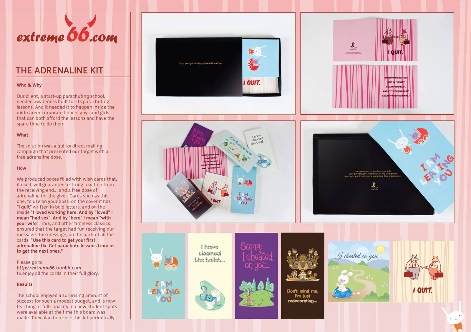 This professional campaign titled 'Wish-cards' was published in Slovakia in July, 2011. It was created for the brand: Extreme66.com, by ad agency: Jandl. This Static Images medium campaign is related to the Recreation, Leisure industry and contains 1 media asset. It was submitted over 14 years ago.