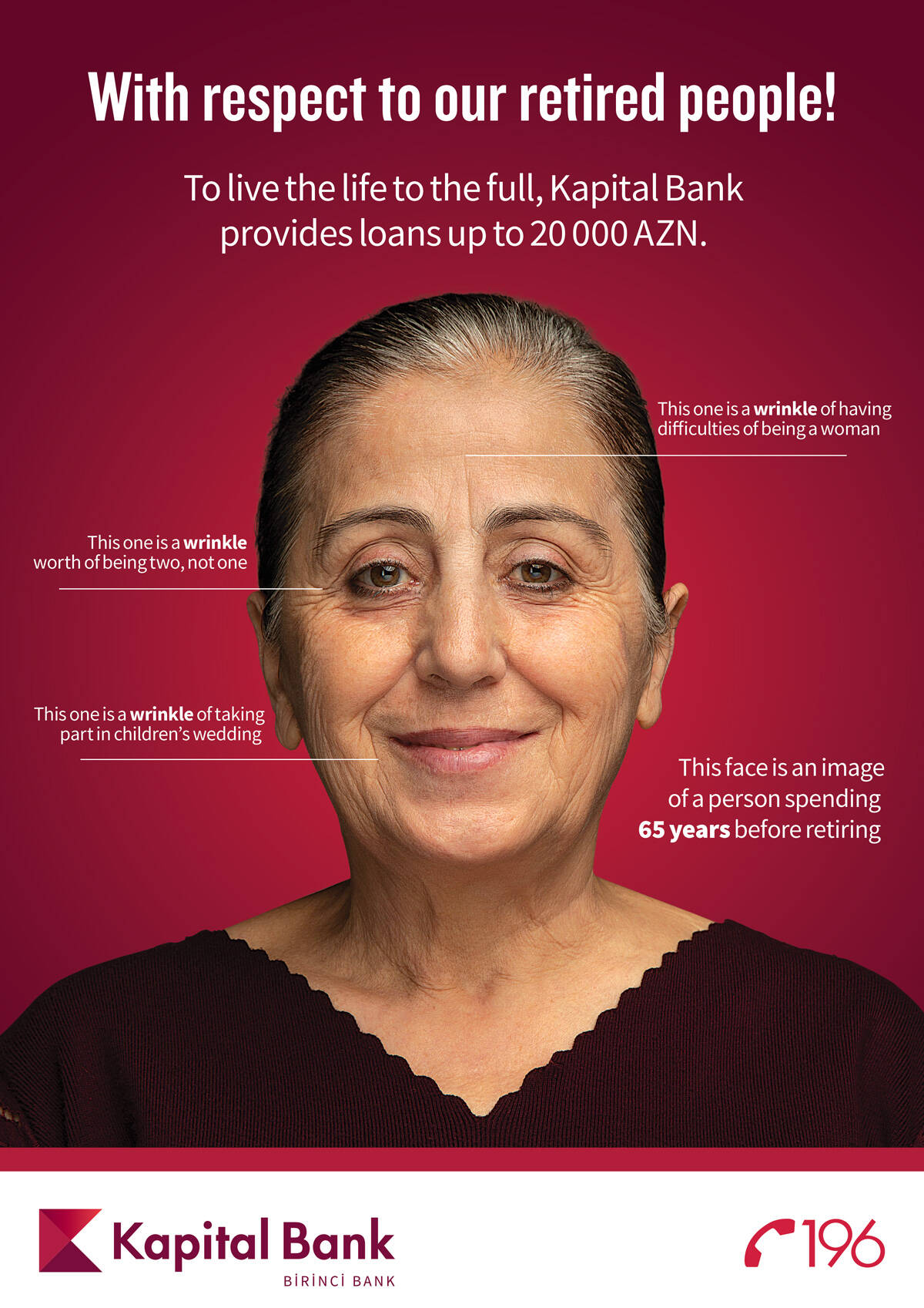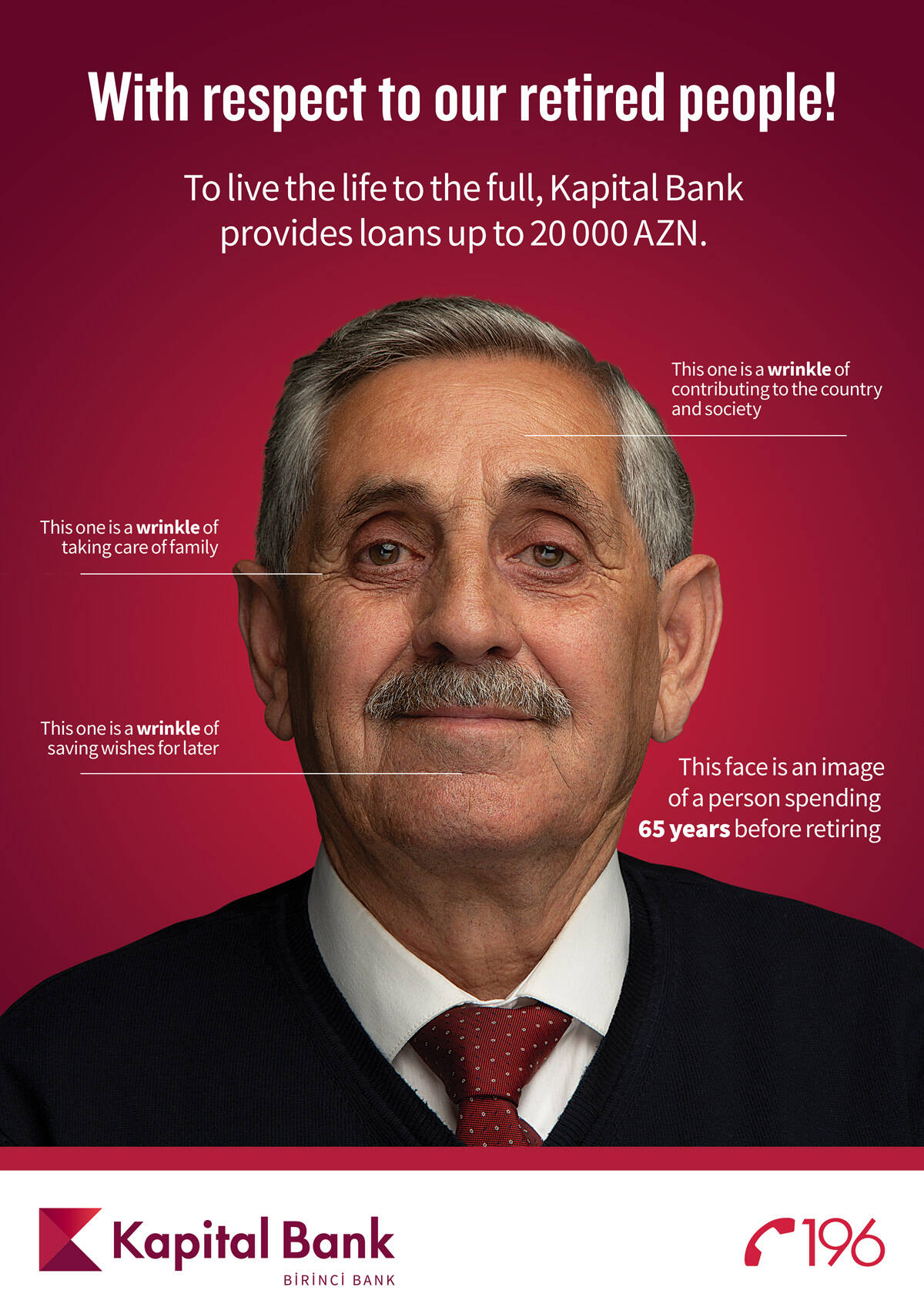 Wrinkles are the marks of life. Every wrinkle has its own meaning: love, pain, hard work, suffering, sacrifice and so on. Before reaching retirement age, people get so many of these wrinkles. After years full of diligence and commitment, every retiree deserves all the things he denied himself all through the years. To that end, they are offered an advantageous loan that can make their wishes come true. We developed a poster for a loan campaign held by one of the biggest banks in Azerbaijan — Kapital Bank. Instead of giving a direct promo message, we wanted to touch their feelings. Now they can meet their needs with an affordable loan. Now it’s easy and fast. Just like they always wanted.