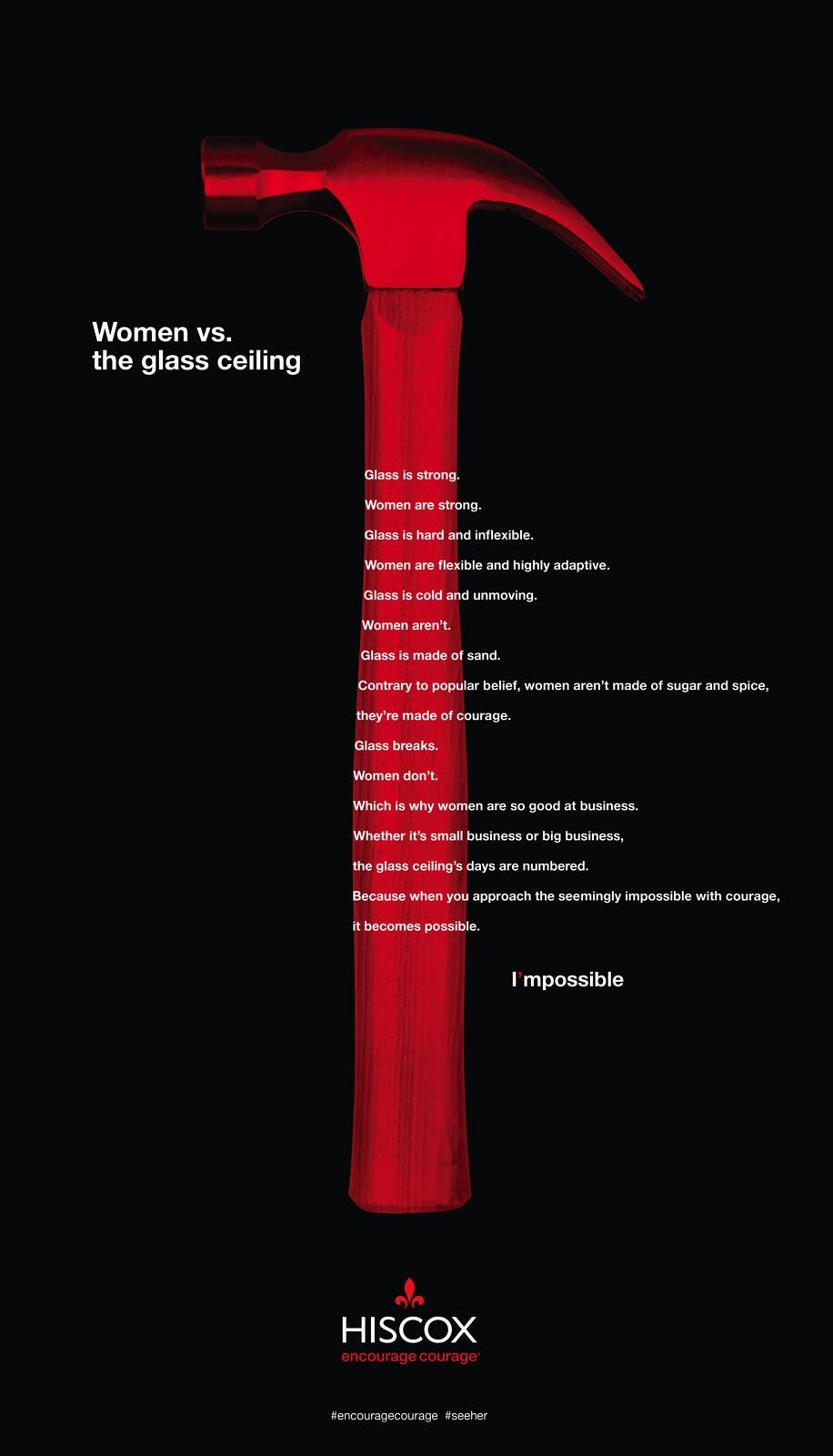 Hiscox unveiled a powerful, strongly worded new ad in honor of International Women's Day. The full-page ad, which ran in The New York Times, applauds women who courageously continue to break through the glass ceiling. It is the next evolution of the successful "I'mpossible" campaign created by gyro New York.