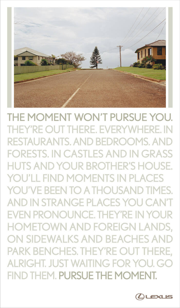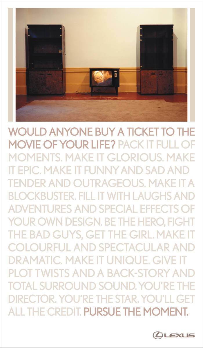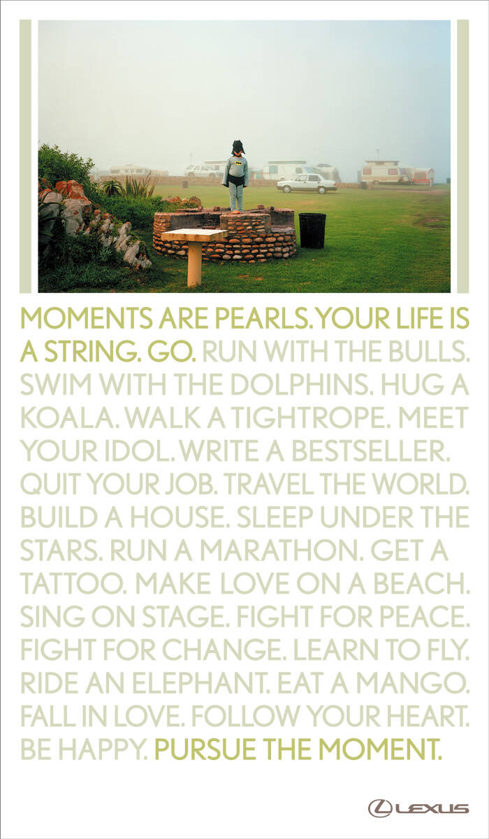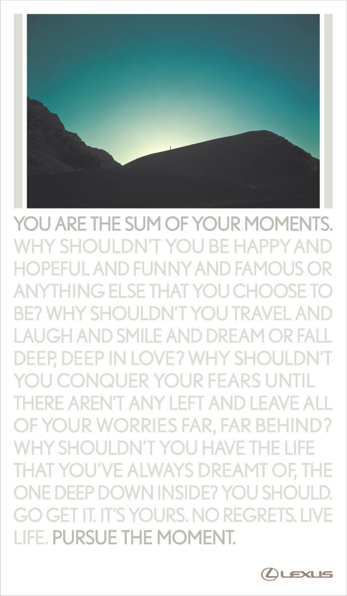 This professional campaign titled 'Won't pursue you, Sum of your moments, Someday I will, Sa...' was published in Canada in March, 2007. It was created for the brand: Lexus, by ad agency: Dentsu. This Print medium campaign is related to the Automotive and Personal Transportation industry and contains 10 media assets. It was submitted over 18 years ago.
