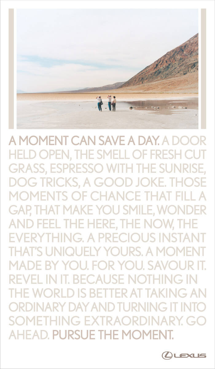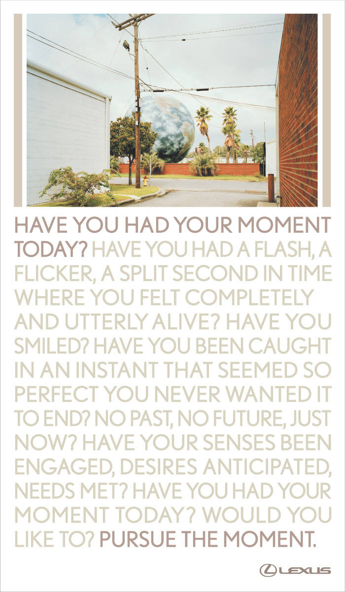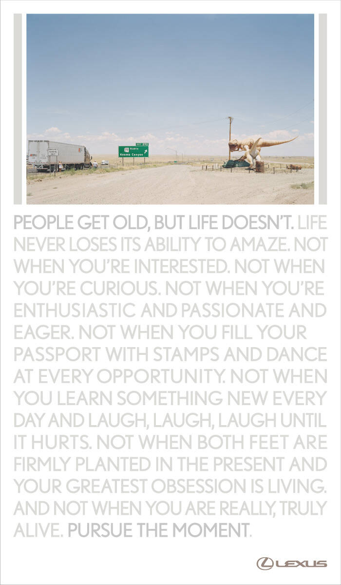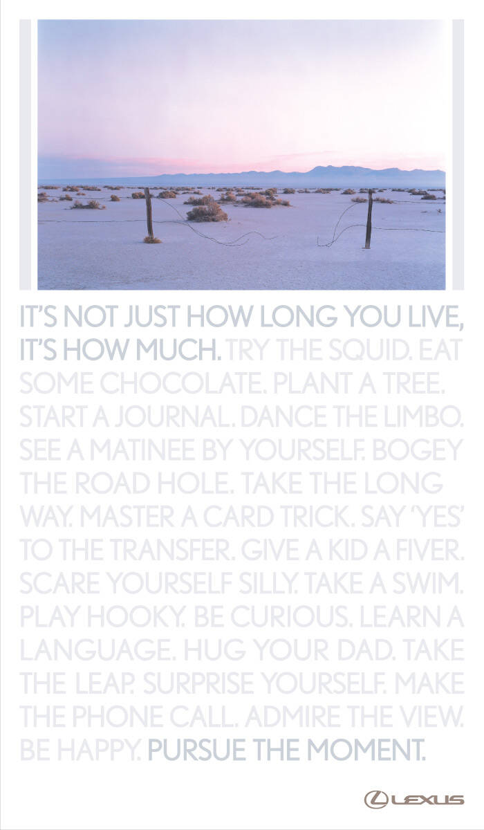 This professional campaign titled 'Won't pursue you, Sum of your moments, Someday I will, Sa...' was published in Canada in March, 2007. It was created for the brand: Lexus, by ad agency: Dentsu. This Print medium campaign is related to the Automotive and Personal Transportation industry and contains 10 media assets. It was submitted over 18 years ago.