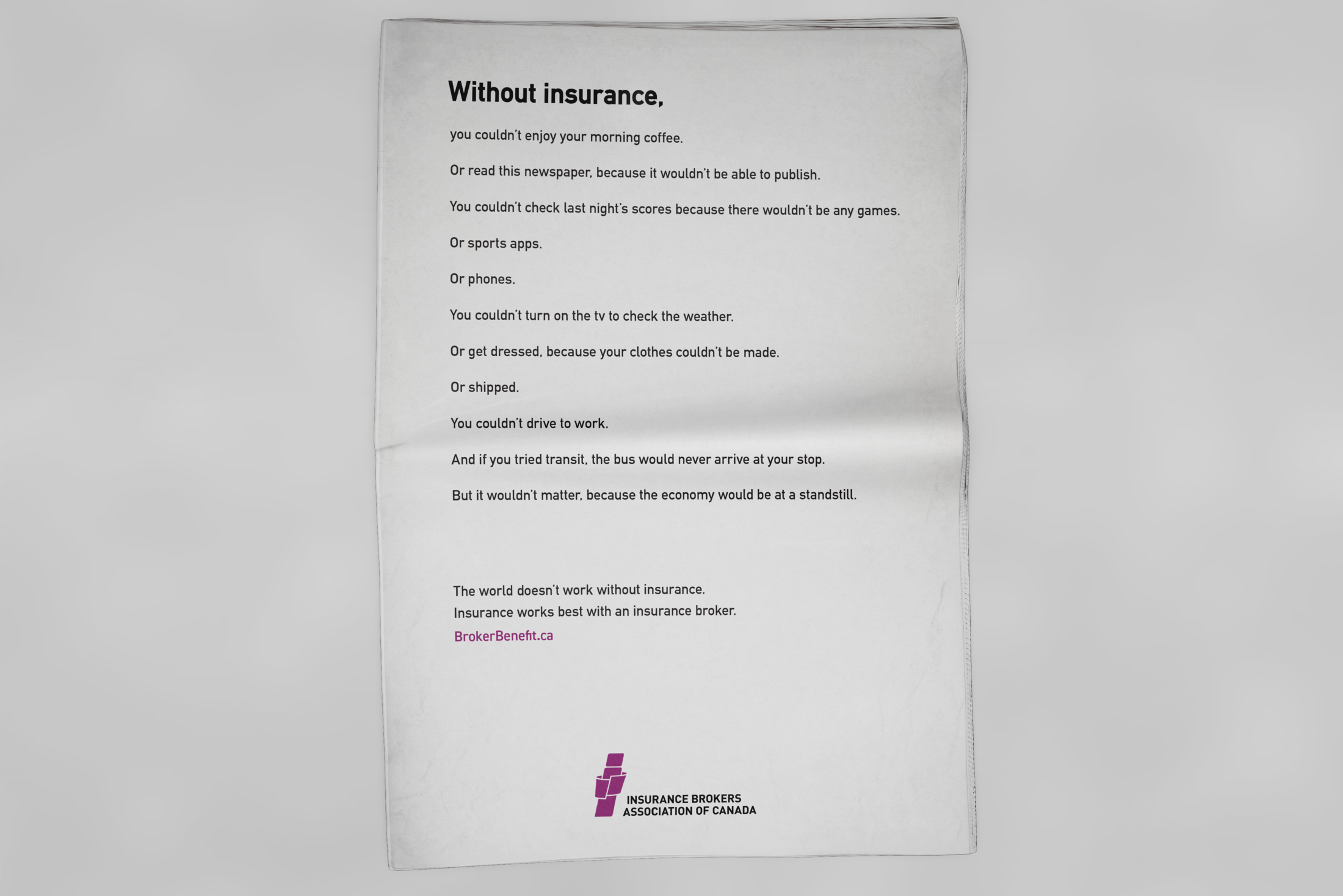 The world doesn't work without insurance. Everything we rely on, from industry and commerce to housing and transportation, couldn’t operate. Insurance brokers ensure that families and businesses get expert advice regarding the coverage that works best for them. That's the insight driving this new advertising platform for the Insurance Brokers Association of Canada.
