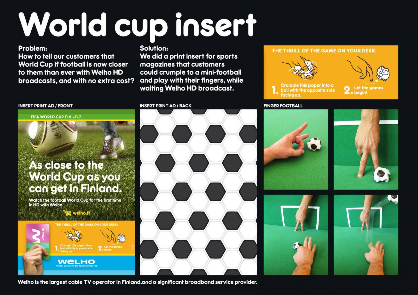 How to tell our customers that World Cup if football is now closer to them than ever with Welho HD broadcasts, and with no extra cost? Solution: 358 Helsinki did a print insert for sports magazines that customers could crumple to a mini-football and play with their fingers, while waiting Welho HD broadcast.