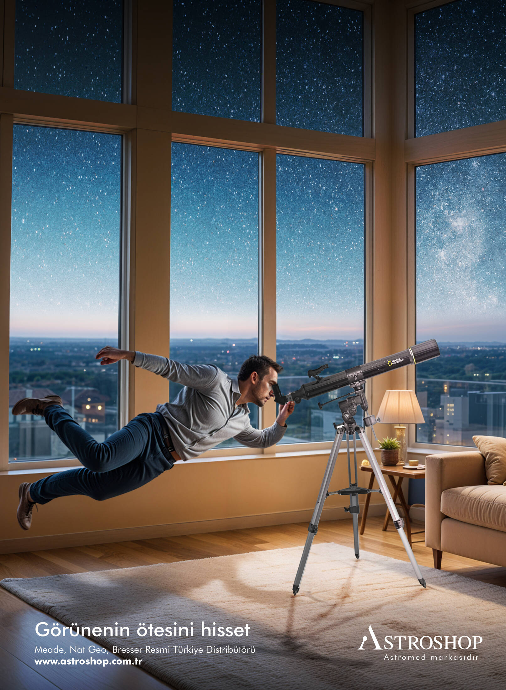 In the study we prepared for the brand Astromed; Astroshop e-commerce site within Astromed was selected as the medium. A visual solution was used to depict the scene in which a man looking at the sky with a telescope he bought from Astroshop is lifted off the ground and enters a zero-gravity environment the moment he focuses on the telescope. Therefore, the narrative in our visual solution more effectively reflects Astromed's mission by emphasizing the deep experience and sense of discovery offered by the use of telescopes.