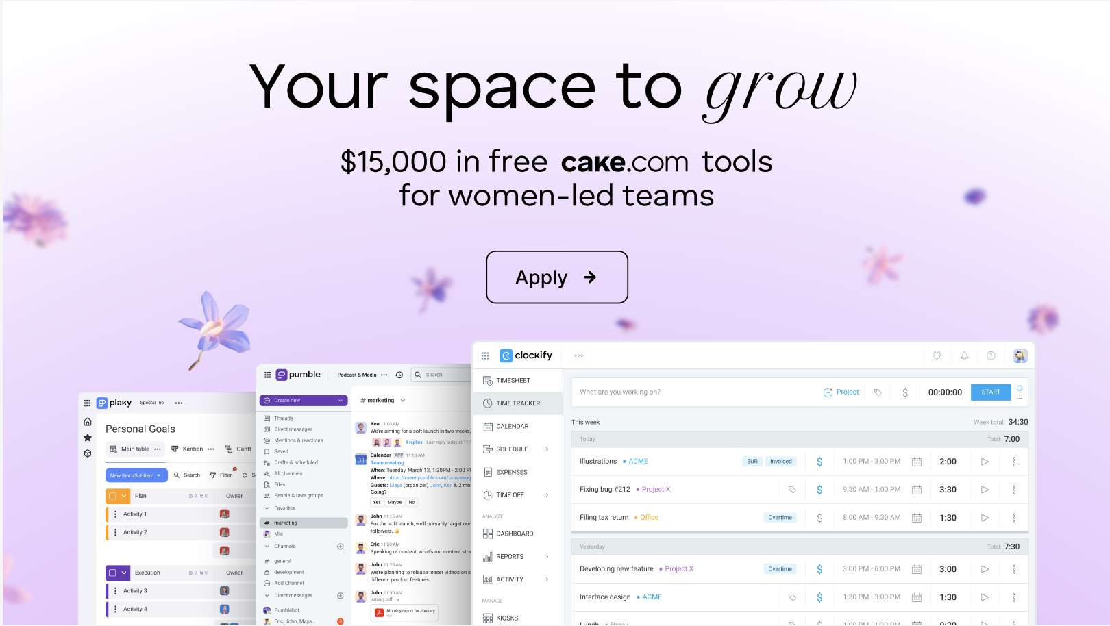 “Your Workspace to Grow” is a $15,000 enterprise software grant for women-led teams at the hardest inflection point: past validation, not yet scaled. CAKE.com distributes up to 100 seats of its full productivity suite (Clockify, Pumble, Plaky) to women-owned businesses — 12 months of enterprise access, free onboarding, 24/7 support.