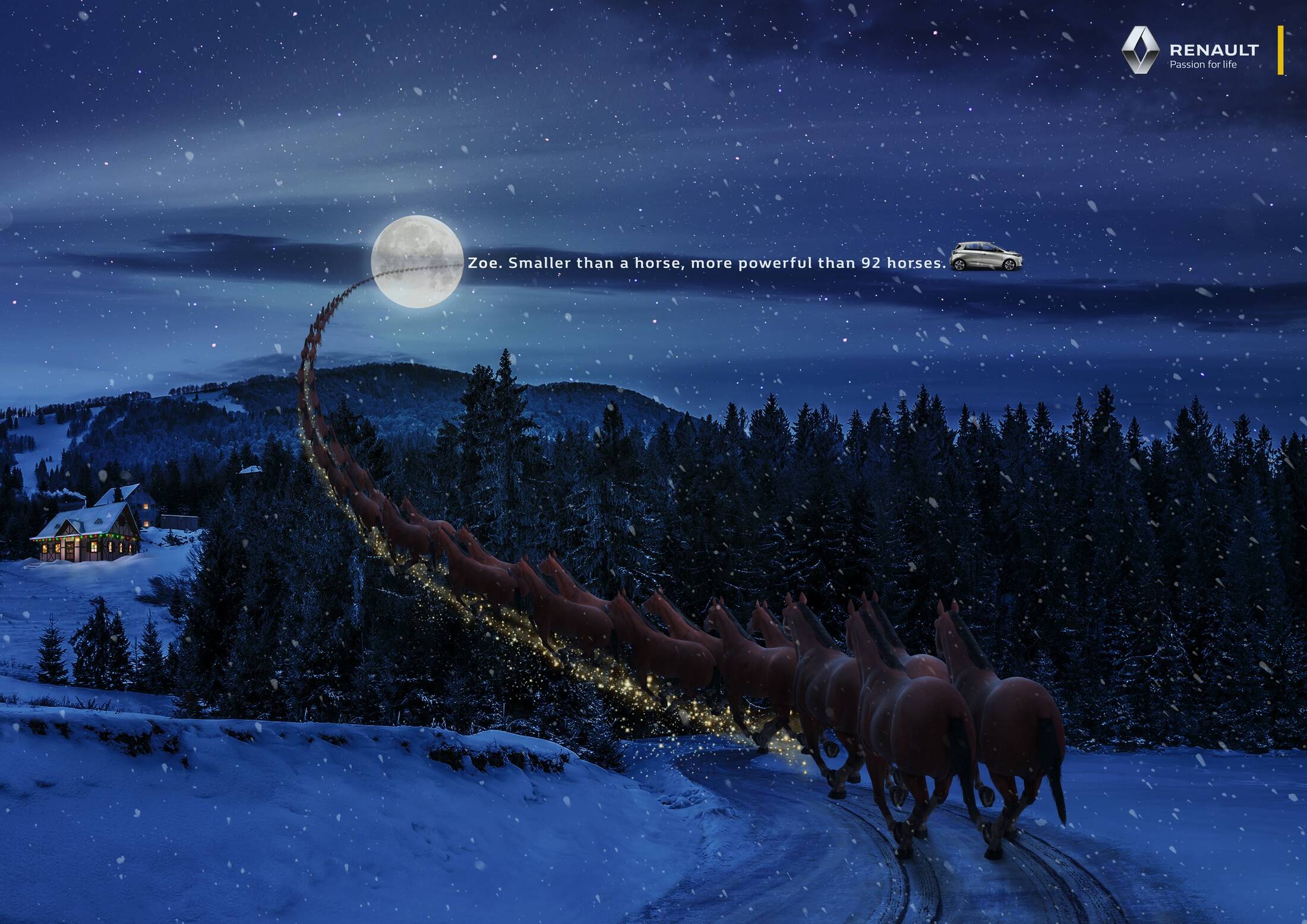 Zoe, a new generation electric car by Renault. Our print celebrates the new year by using Santa’s sleigh as a metaphor. Zoe is small. Zoe is powerful. Happy new year!